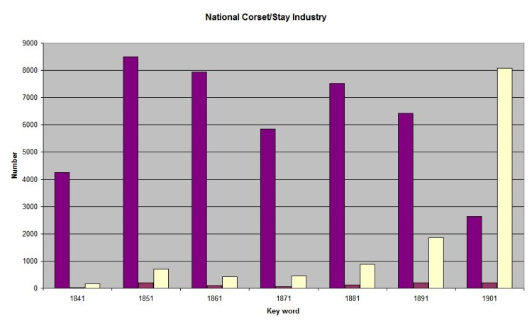 Nationally, the number of women employed in ‘stay making’ seems to peak in 1851. It is interesting to see how ‘corset making’ took over by the turn of the century: