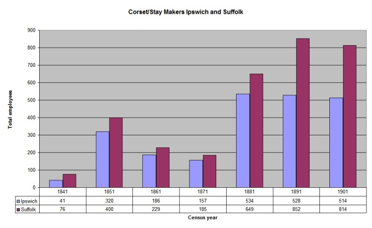 At the beginning of the stay’s rise in popularity, Suffolk started small with most ‘stay makers’ doing piece work at home. In 1871, workers in Suffolk were still outnumbered by Devon, Gloucestershire, Hampshire, Lancashire, London, Somerset, Warwickshire and Yorkshire. With the help of ten year’s local development, by 1881, the number in Suffolk had almost quadrupled to 606, bringing the County to fifth in the country for number of workers in the trade, taking over manufacturers in the north. By 1891 the industry had become even more influential on the national ‘scene’ and while numbers were leveling off, the County was only ‘beaten’ by London (916), Gloucestershire (962) and Hampshire (1084) in terms of employees.