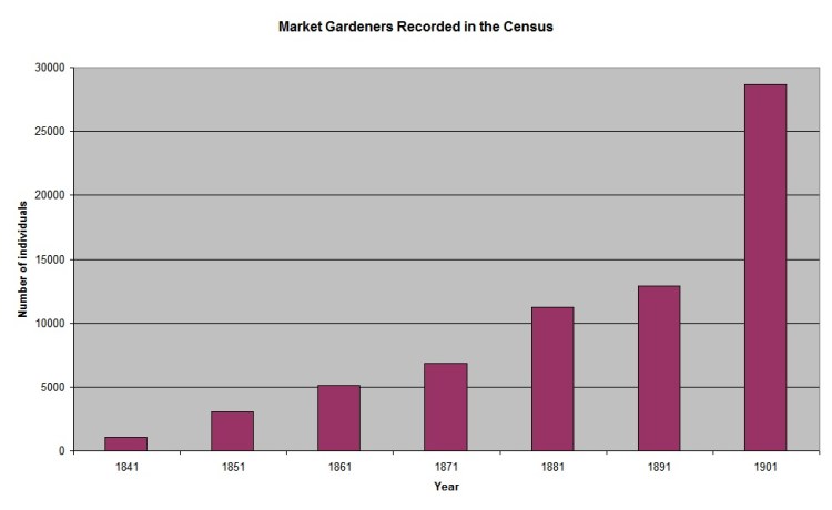 A key word search in the census for ‘market gardener’ reveals the growth of this type of farming as an occupation across the country during Victoria’s reign. About a thousand were recorded in 1841. This figured tripled over the next decade, and almost doubled again over the next (by 1861 there were 5100). The total more than doubled all over again during the next twenty years to 1881. By 1901, a total of 28,700 individuals were employed as market gardeners – and those are only the ones captured by the census.