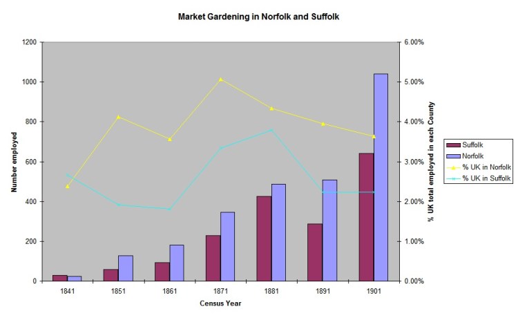 During the middle of the Victorian period, Norfolk contributed a little over 5% of the Country’s market gardeners, and Suffolk was about 1.5% behind its neighbour. Based on Norfolk’s population, market gardening rose from the occupation of less than one in every ten thousand people in 1841 to one in every 500 by 1901. In Suffolk, proportions were roughly half that recorded in Norfolk.