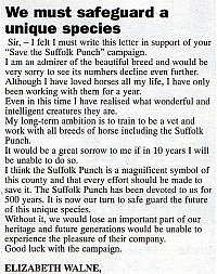 I’ve been a fan of the Suffolk Horse (also sometimes known as the Suffolk Sorrel) for a very long time. A few weeks ago, Mum sent me a scanned copy of a letter I wrote as a teenager which was printed in the East Anglian Daily Times. The letter was in support of their ‘Save the Suffolk Punch’ campaign which was launched in 2001 when the stud at Hollesley was under threat. I was 15 at the time and a typo lives on to haunt me to this day:
