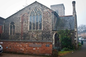 Follow the road round to the left with the Cathedral Close to your right. Walk past the Adam and Eve and continue along Bishopgate. St Helen will soon appear to your left, attached to the much larger premises of the Great Hospital.