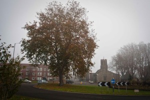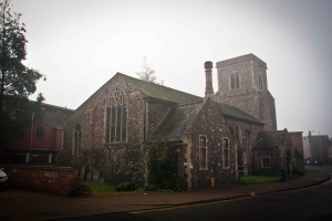 Retrace your steps back to Whitefriars and continue across the river. St Martin at Palace is in front of you, again with a churchyard above the level of the road. Normally, you would see the spire of the Cathedral to it’s right, but it’s very faint in the photograph here thanks to the mist.