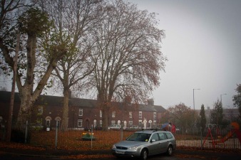 Continue under the flyover and head east towards another large roundabout. The children’s play area is the site of another church never rebuilt after World War Two bombing – St Paul’s. Some of the trees which used to edge its churchyard remain.