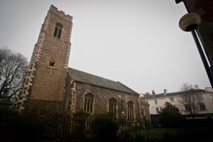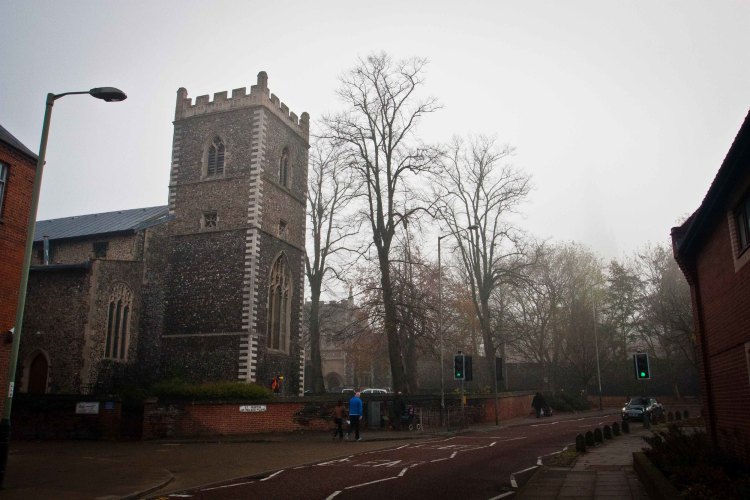 Continue towards the roundabout. Opposite where you stand is St James Pockthorpe, now better known as the Norwich Puppet Theatre.