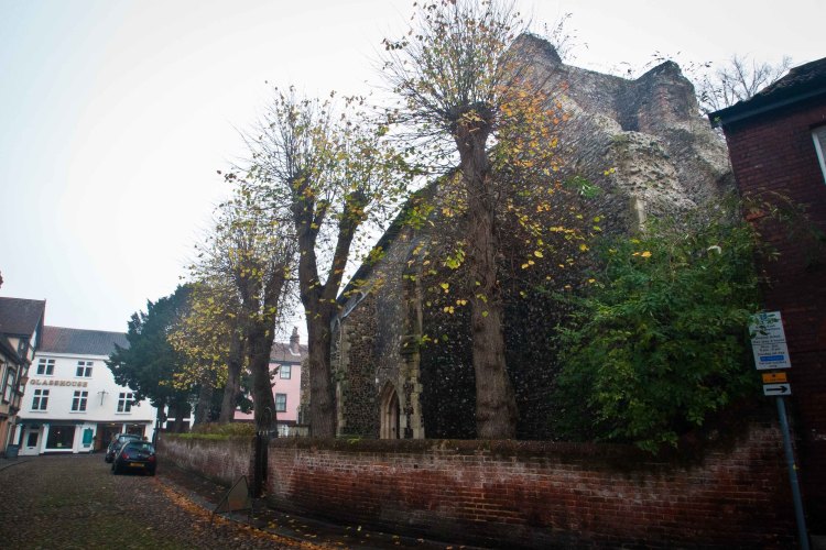 Turn left up the famous, cobbled, Elm Hill and pass the back of Blackfriars Hall. The small church at the top of the hill is St Peter Hungate.